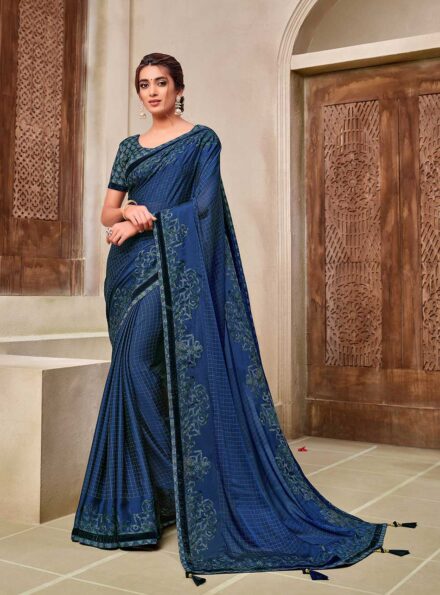 Blue Silk Georgette Saree With Metallic Foil Print, applique Work