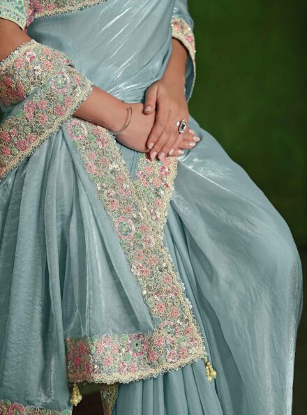Sea Green 2 Tone Satin Silk Multi Sequence with Handwork Saree with Stitched Blouse
