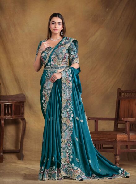 Teal Two Tone Satin Silk Pure Handwork Ready to wear Saree with Stitched Blouse
