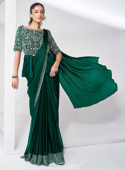 Green Shimmer Chiffon Pure Handwork Ready to wear Saree with Stitched Blouse