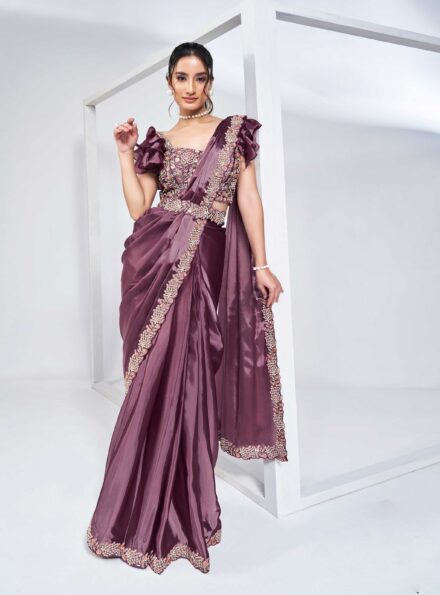 Lavendar Crepe Satin Silk Pure Handwork Ready to wear Saree with Stitched Blouse