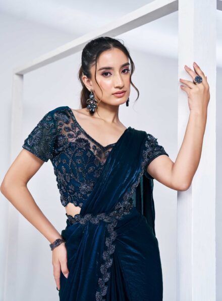 Blue Crush Satin Silk Sequins work Saree with Unstitched Blouse