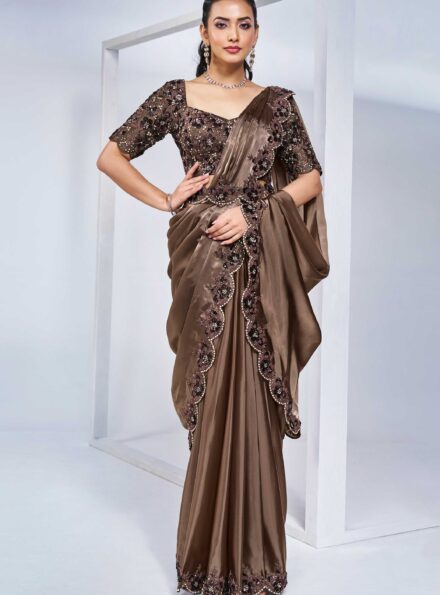 Brown Crepe Satin Silk Pure Handwork Ready to wear Saree with Stitched Blouse